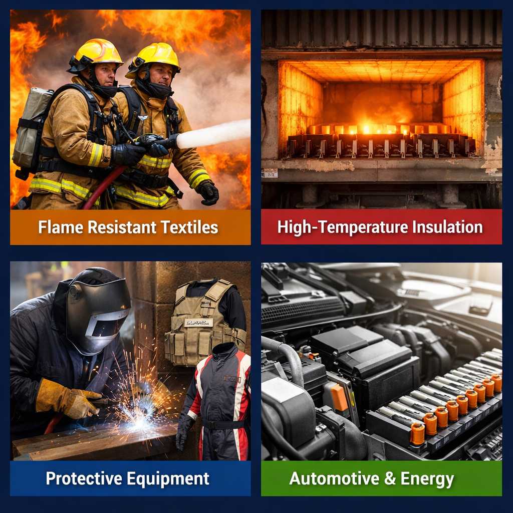 Nó được sử dụng rộng rãi như mộtvật liệu chịu nhiệt và chống cháy, bao gồm vật liệu cách nhiệt xây dựng, vật liệu cách nhiệt chống cháy và cách nhiệt lò nhiệt độ cao. Nó cũng được sử dụng tronghàng dệt bảo vệchẳng hạn như quần áo bảo hộ nhiệt, bộ quần áo chữa cháy và chăn chữa cháy. Hơn nữa, nó có thể được áp dụng trongkhoang động cơ ô tô và pin lưu trữ năng lượnglàm vật liệu cách nhiệt chống cháy.